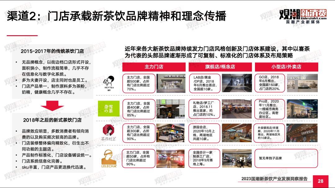 2023年,线下渠道权重回升,对主营线下的新茶饮品牌来说,门店升级迫在眉睫。一方面,品牌在门店标准化基础上优化视觉展陈,让门店在售卖功能之外和消费者建立深层链接,即借助“内容化”产生传播属性;另一方面,品牌将更多SKU和业务线封装到门店当中,并根据不同区域设置不同店型和场景,以此提升单店利润率。