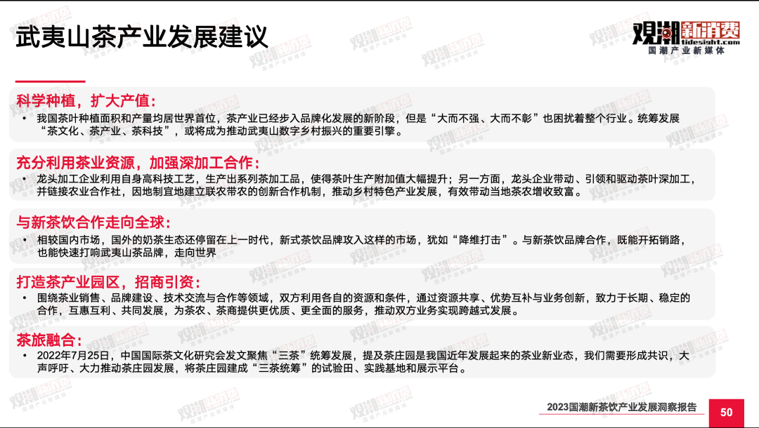 第二,从科技投入来说,茶叶深加工领域的持续提升,将促进更完善的产业标准化目标加速实现,这也是武夷山茶做好补链的过程。在这个过程中,茶企应该加强和创新合作机制,从而有效带动茶农致富,这也是服务乡村振兴的重要举措。