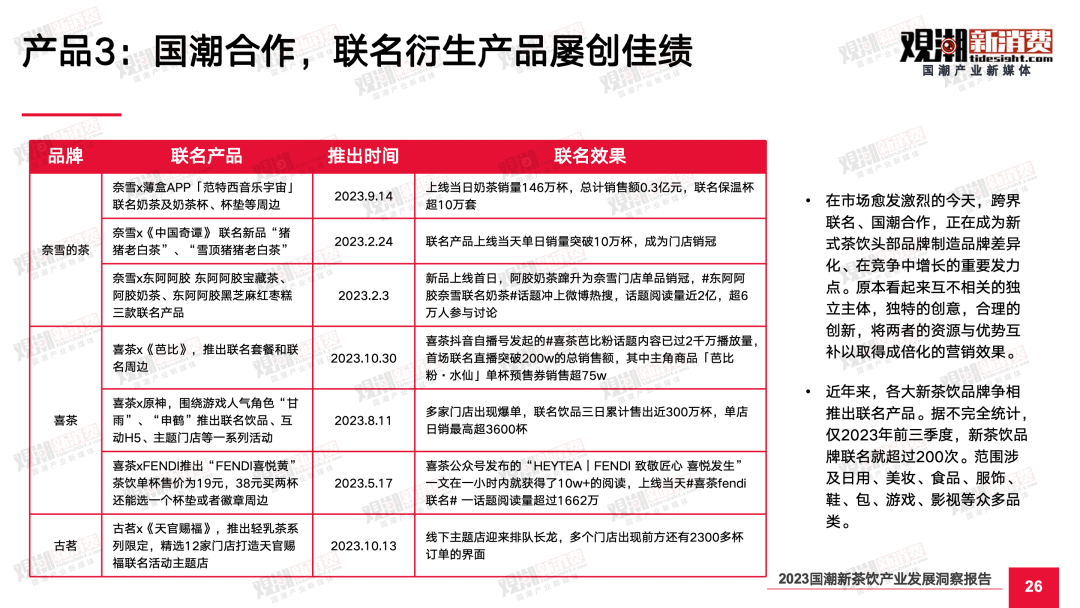 结合新茶饮的运营经验,与高质量国潮IP结合是品牌塑造的有效方式。通过联名,品牌在社交媒体进行生动的茶文化传播,有利于品牌接入未来消费市场;而基于联名开发的品牌衍生产品和服务,还将助力品牌开辟新的业务领域。