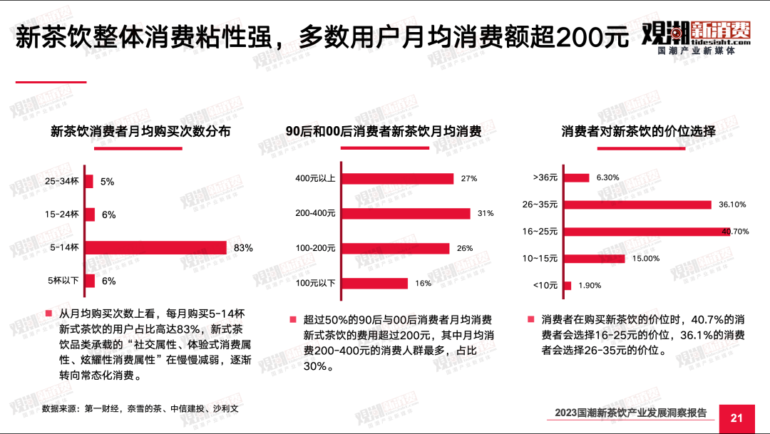 整体而言,新茶饮是一种休闲型消费,但呈现出明显的“刚需”属性。基于茶与糖共同作用形成的“瘾品”效应,新茶饮的消费者呈现出高频次(每周1-2杯新茶饮)、多投入(月均消费达200-400元),并倾向于中等以上价格段(16-35元)的消费习惯。鉴于新茶饮的消费粘性,其也被冠以年轻人的新晋“快乐水”之名。