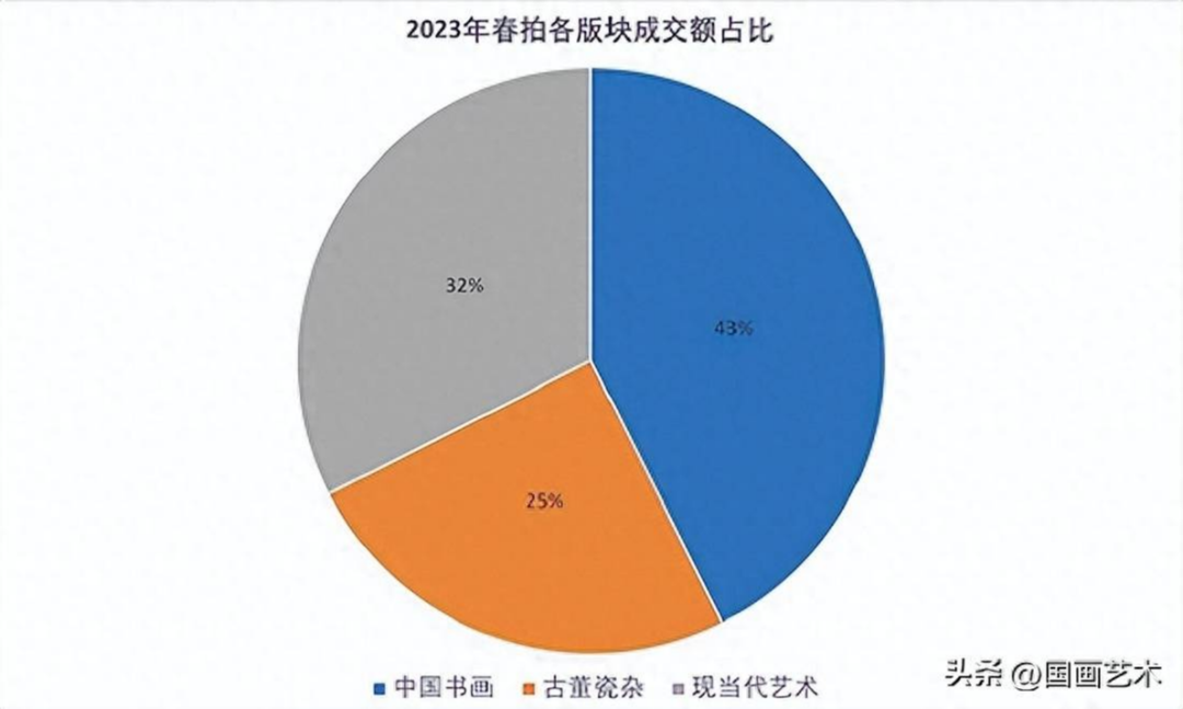 中国文物艺术品拍卖市场的主要份额聚焦于中国书画、现当代艺术与古董瓷杂三大版块中。笔者对2023年春拍中12家样本拍卖公司的版块成交额占比进行统计分析,其中中国书画版块占比43%,古董瓷杂版块占比25%,现当代艺术版块占比32%。